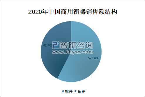 2020年中国案秤销售额占商用衡器销售总额的57.60%,占比较大;台秤销售额占商用衡器销售总额的42.40%,占比较小。