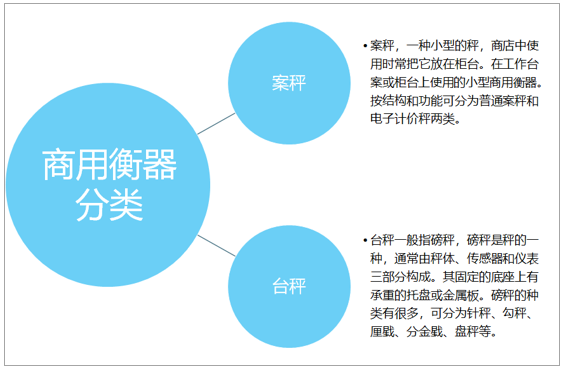 商用衡器主要包括案秤和台秤。案秤,一种小型的秤,商店中使用时常把它放在柜台。在工作台案或柜台上使用的小型商用衡器。按结构和功能可分为普通案秤和电子计价秤两类。台秤一般指磅秤,磅秤是秤的一种,通常由秤体、传感器和仪表三部分构成。其固定的底座上有承重的托盘或金属板。磅秤的种类有很多,可分为针秤、勾秤、厘戥、分金戥、盘秤等。