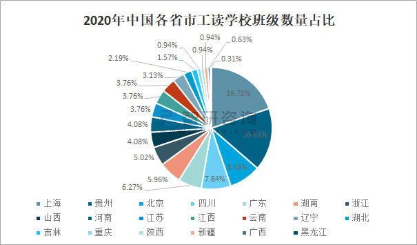 2020年上海工读学校班级数量占全国工读学校班级总数的19.75%,占比最大;贵州工读学校班级数量占全国工读学校班级总数的16.61%;北京工读学校班级数量占全国工读学校班级总数的8.46%;四川工读学校班级数量占全国工读学校班级总数的7.84%;广东工读学校班级数量占全国工读学校班级总数的6.27%。
