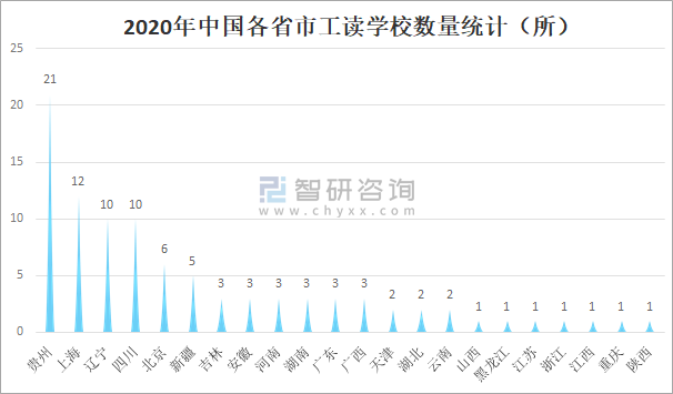 分省市来看,2020年贵州工读学校数量为21所,全国排名第一;上海工读学校数量为12所,全国排名第二;辽宁工读学校数量为10所,全国排名第三;四川工读学校数量为10所,并列排名第三。