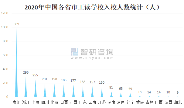 分省市来看,2020年贵州工读学校入校人数为989人,全国排名第一;浙江工读学校入校人数为296人,全国排名第二;上海工读学校入校人数为255人,全国排名第三。