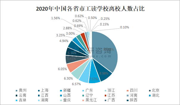 2020年贵州工读学校离校人数占全国工读学校离校总人数的35.43%,占比最大;上海工读学校离校人数占全国工读学校离校总人数的8.98%;新疆工读学校离校人数占全国工读学校离校总人数的7.57%。