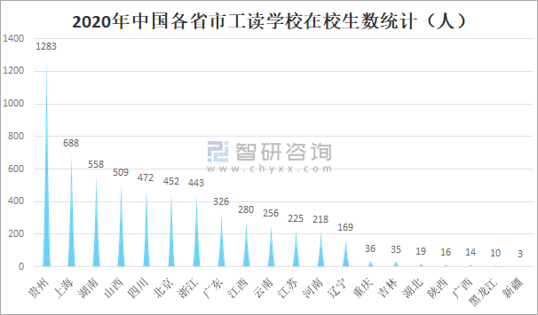 分省市来看,2020年贵州工读学校在校生数为1283人,全国排名第一;上海工读学校在校生数为688人,全国排名第二;湖南工读学校在校生数为558人,全国排名第三。