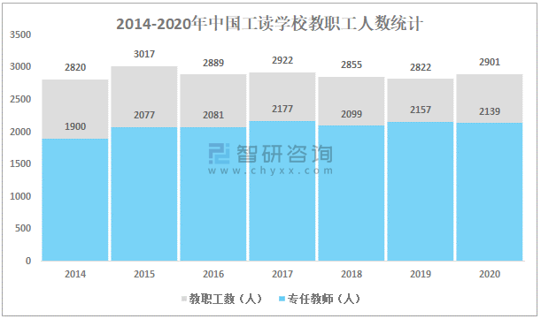 2020年中国工读学校教职工人数稳中有升,2020年中国工读学校教职工人数达2901人,较2019年增加了79人,同比增长2.8%,其中专任教师人数达2139人。