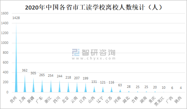 分省市来看,2020年贵州工读学校离校人数为1428人,全国排名第一;上海工读学校离校人数为362人,全国排名第二;新疆工读学校离校人数为305人,全国排名第三。