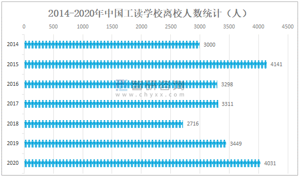 2020年中国工读学校离校人数增幅明显,2020年中国工读学校离校人数达4031人,较2019年增加了582人,同比增长16.9%。