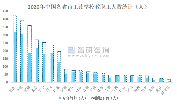 分省市来看,2020年贵州教职工数人数为422人,专任教师人数为318人;上海教职工数人数为391人,专任教师人数为307人;新疆教职工数人数为362人,专任教师人数为185人。