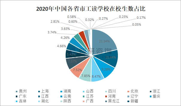 2020年贵州工读学校在校生数占全国工读学校在校生总数的21.34%,占比最大;上海工读学校在校生数占全国工读学校在校生总数的11.44%;湖南工读学校在校生数占全国工读学校在校生总数的9.28%。