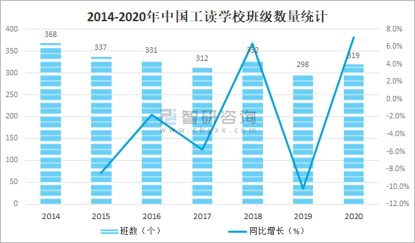 随着中国工读学校数量的增加,班级数量也随之增加,2020年中国工读学校班级数量达319个,较2019年增加了21个,同比增长7.0%。