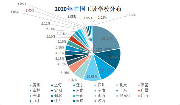 中国工读学校主要分布在贵州、上海、辽宁、四川等地,2020年贵州工读学校数量占全国工读学校总数的22.11%,占比最大;上海工读学校数量占全国工读学校总数的12.63%;辽宁工读学校数量占全国工读学校总数的10.53%;四川工读学校数量占全国工读学校总数的10.53%。