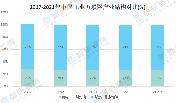 2020年中国工业互联网直接产业增加值占27%,渗透产业增加值占73%。预计2021年中国工业互联网直接产业增加值占26%,渗透产业增加值占74%。我国工业互联网产业结构不断优化,工业互联网能够与制造、能源、交通、建筑、农业等实体经济进行深度融合,推动实体经济蓬勃发展,我国工业互联网正在加速同各行业深度融合,未来将进一步渗透到更多细分行业,加速促进一二三产业融通发展。