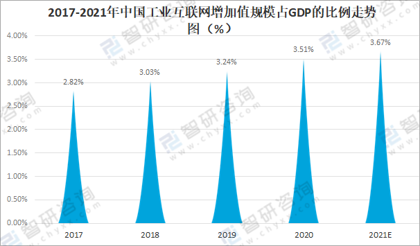 2017-2021年中国工业互联网增加值规模占GDP的比例走势图
