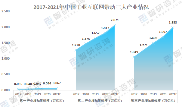 工业互联网应用场景广泛,目前已延伸至40个国民经济大类,涉及原材料、装备、消费品、电子等制造业各大领域,以及采矿、电力、建筑等实体经济重点产业,形成了千姿百态的融合应用实践。2020年中国工业互联网带动第一产业、第二产业、第三产业的增加值规模分别为0.056万亿元、1.817万亿元、1.697万亿元,名义增速为19.48%、9.97%、13.28%,工业互联网带动各行业的增加值规模持续提升。在国民经济稳定恢复的情况下,预计2021年工业互联网带动三大产业增加值规模将高速提升,工业互联网带动第一产业、第二产业、第三产业的增加值规模将分别达到0.067万亿元、2.071万亿元、1.988万亿元。