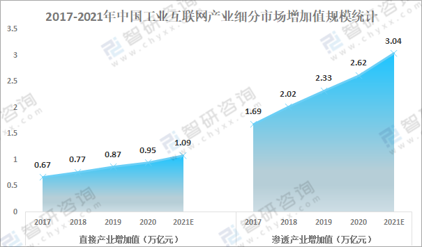 2017-2021年中国工业互联网产业细分市场增加值规模统计