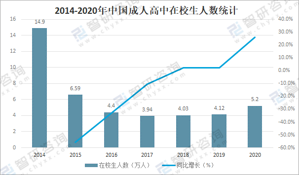 随着成人高中注册学生人数的增加,在校生人数也随之增长,2020年中国成人高中在校生人数达5.2万人,较2019年增加了1.08万人,同比增长26.2%。