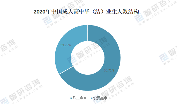 其中,2020年中国职工高中毕(结)业生人数为26356人,占全国成人高中毕业生总人数的66.71%,占比非常大;农民高中毕(结)业生人数为13152人,占全国成人高中毕业生总人数的33.29%。