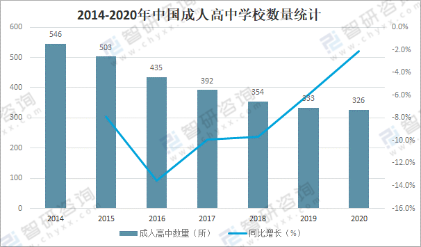 成人高中是我国教育行业的重要组成部分,但近年来中国成人高中学校数量逐年减少,截止2020年中国共有326所成人高中学校,较2019年减少了7所,同比减少2.1%。