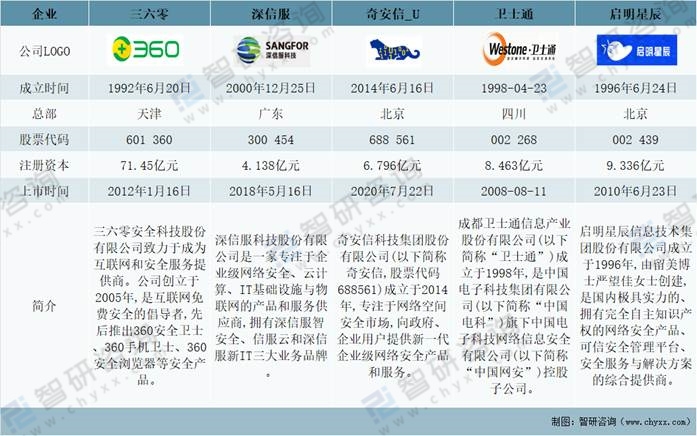 经过多年的发展,中国网络安全企业遍地开花,一大批优秀的网络安全企业迅速崛起,逐渐成为网络安全行业中的翘楚,如三六零、深信服、奇安信、卫士通、启明星辰等,从成立时间来看三六零成立时间要早于深信服、奇安信、卫士通和启明星辰,但卫士通上市时间要早于三六零、深信服、奇安信和启明星辰,三六零总部在天津,深信服总部在广东,奇安信总部在北京,卫士通总部在四川,启明星辰总部在北京。