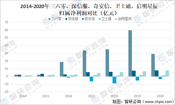 2014-2020年三六零、深信服、奇安信、卫士通、启明星辰归属净利润对比(亿元)