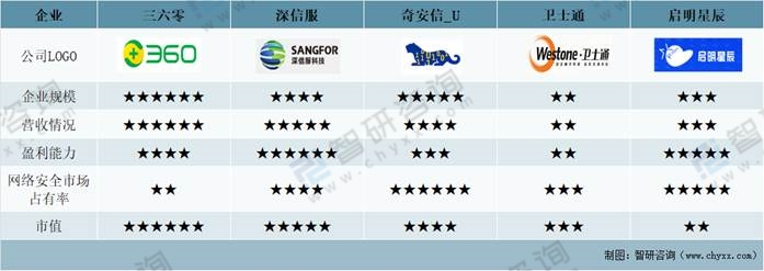 三六零在企业规模、营收情况和市值方面均优于深信服、奇安信、卫士通和启明星辰,深信服在盈利能力方面优于深信服、奇安信、卫士通和启明星辰,奇安信在网络安全市场占有率方面优于三六零、深信服、卫士通和启明星辰。