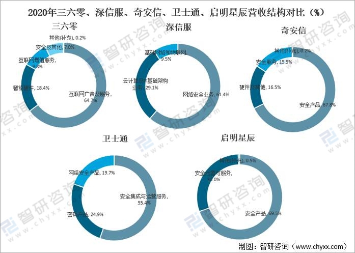 2020年三六零、深信服、奇安信、卫士通、启明星辰营收结构对比(%)