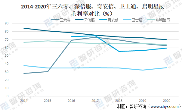 2014-2020年三六零、深信服、奇安信、卫士通、启明星辰毛利率对比(%)