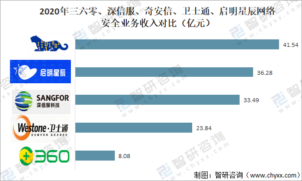 从网络安全业务收入来看,2020年奇安信网络安全业务收入为41.54亿元;启明星辰网络安全业务收入为36.28亿元;深信服网络安全业务收入为33.49亿元;卫士通网络安全业务收入为23.84亿元;三六零网络安全业务收入为8.08亿元。