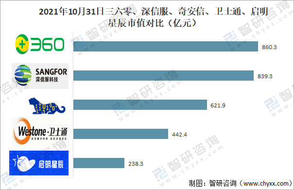 从市值来看,2021年10月31日三六零市值为860.3亿元,深信服市值为839.3亿元,奇安信市值为621.9亿元,卫士通市值为442.4亿元,启明星辰市值为238.3亿元,2021年10月31日三六零市值高于深信服、奇安信、卫士通和启明星辰。