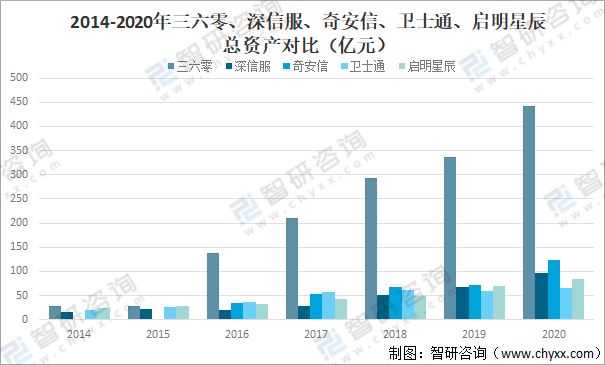 2014-2020年三六零、深信服、奇安信、卫士通、启明星辰总资产对比(亿元)
