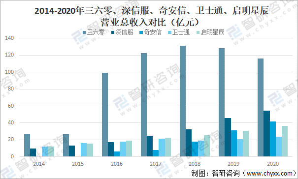 2014-2020年三六零、深信服、奇安信、卫士通、启明星辰营业总收入对比(亿元)