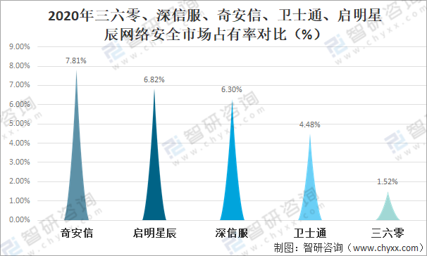 2020年三六零、深信服、奇安信、卫士通、启明星辰网络安全市场占有率对比