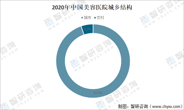 从城乡结构来看,2020年中国城市美容医院数量占全国美容医院总数的94.8%,占比非常大;农村美容医院数量占全国美容医院总数的5.2%,占比较小。