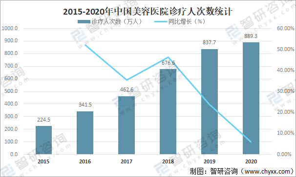 随着中国美容医院数量的增加,诊疗人数快速增长,2020年中国美容医院诊疗人次数达889.3万人,较2019年增加了51.59万人,同比增长6.16%。