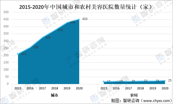 其中,2020年中国城市共有453家美容医院,较2019年增加了24家;农村共有25家美容医院,较2019年增加了4家。