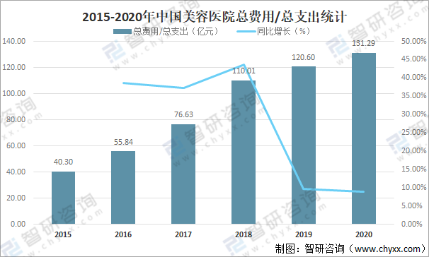 在中国美容医院收入增加的同时,总费用/总支出也在增加,2020年中国美容医院总费用/总支出达131.29亿元,较2019年增加了10.69亿元,同比增长8.86%。