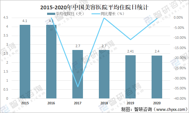 自2019年中国美容医院平均住院日逐年下滑,2020年中国美容医院平均住院日为2.4天,较2019年减少了0.01天,同比减少0.41%。