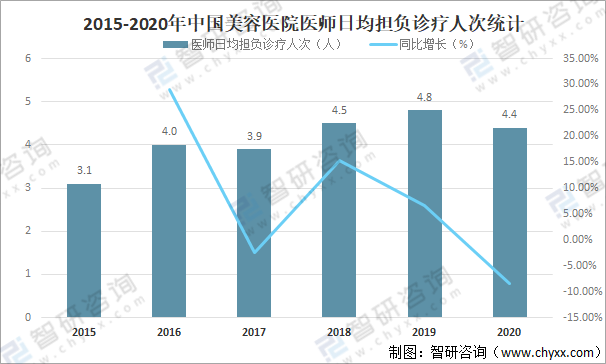 2020年中国美容医院医师日均担负诊疗人次小幅下滑,2020年中国美容医院医师日均担负诊疗人次为4.4人,较2019年减少了0.40人,同比减少8.33%。