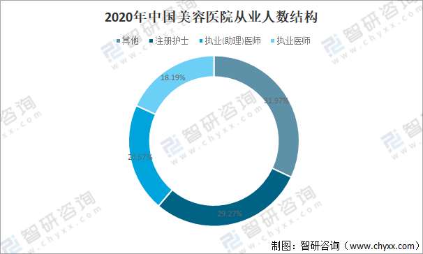 2020年中国美容医院注册护士人数占从业总人数的29.27%;执业(助理)医师人数占从业总人数的20.57%;执业医师人数占从业总人数的18.19%。