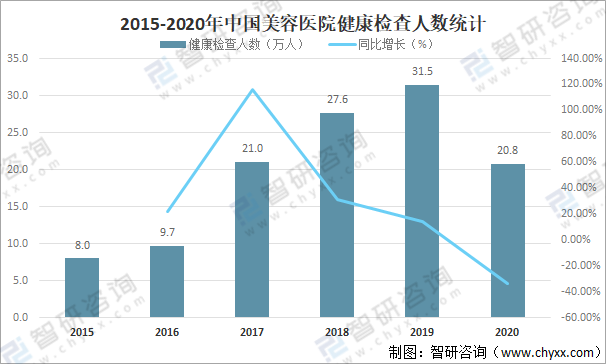 2019年中国美容医院健康检查人数达31.5万人,较2018年增加了3.85万人,同比增长13.94%,2020年较2019年大幅下滑,2020年中国美容医院健康检查人数为20.8万人,较2019年减少了10.68万人,同比减少33.93%。