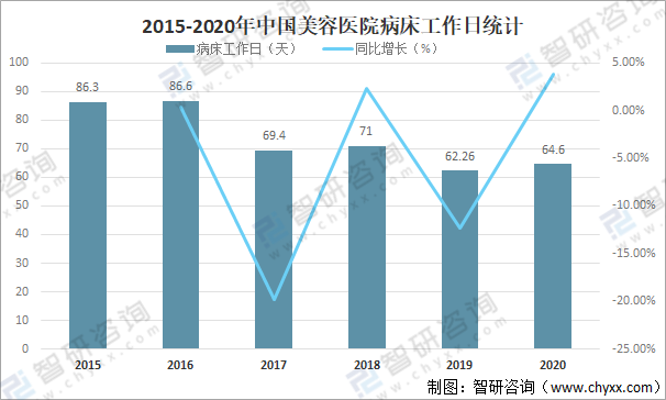 2020年中国美容医院病床工作日为64.6天,较2019年增加了2.34天,同比增长3.76%。