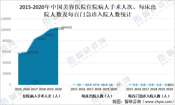2015-2020年中国美容医院住院病人手术人次、每床出院人数及每百门急诊入院人数统计