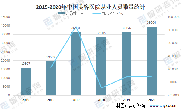 随着中国美容医院数量的增加,2020年中国美容医院从业人员数量达39604人,较2019年增加了3148人,同比增长8.64%。