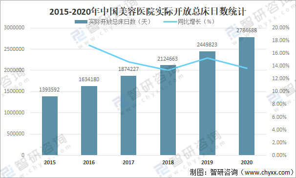 中国美容医院实际开放总床日数逐年增加,2020年中国美容医院实际开放总床日数达2784688天,较2019年增加了334865天,同比增长13.67%。