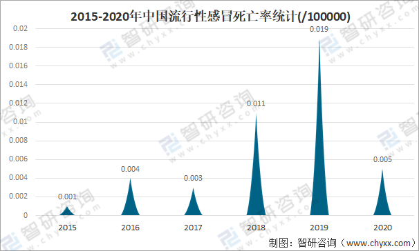 2020年中国流行性感冒发病率及死亡率双双下滑,2020年中国流行性感冒死亡率为0.005/10万,较2015年的0.001/10万增长了0.004/10万。