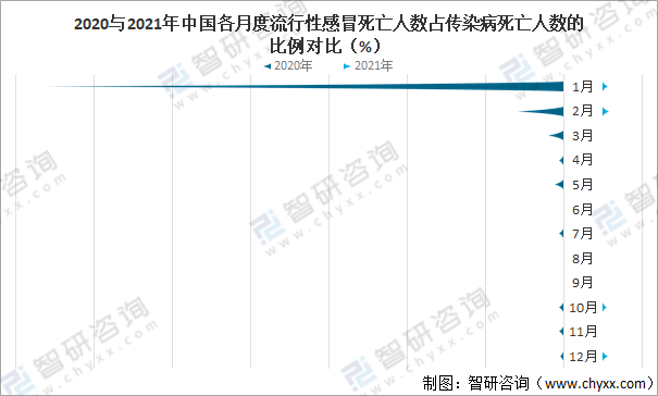 2020与2021年中国各月度流行性感冒死亡人数占传染病死亡人数的比例对比(%)