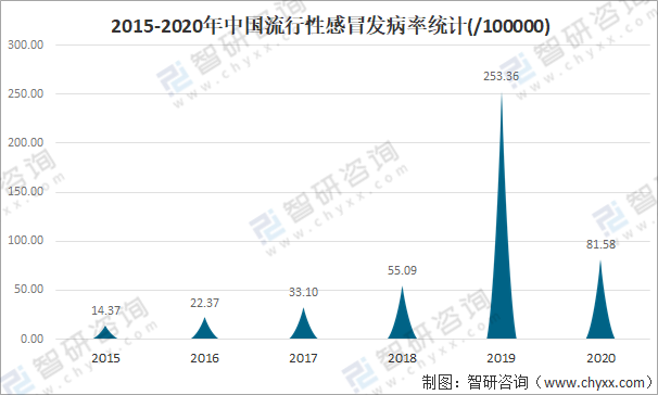 随着中国流行性感冒发病数的减少,发病率也随之减少,2020年中国流行性感冒发病率为81.58/10万,较2015年的14.37/10万减少了67.21/10万。