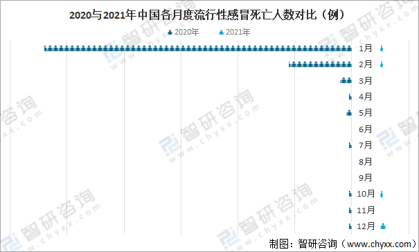 2020与2021年中国各月度流行性感冒死亡人数对比(例)