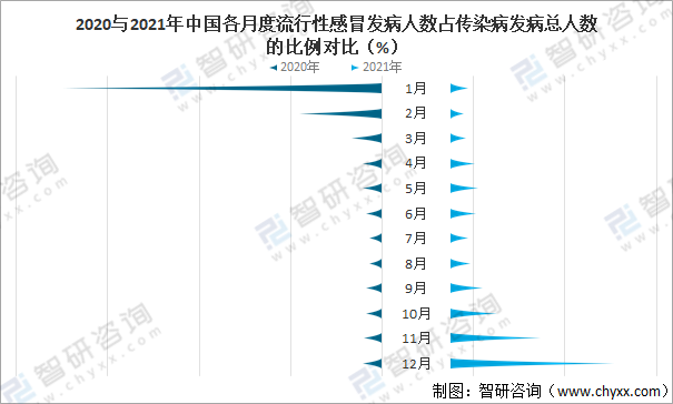 2020与2021年中国各月度流行性感冒发病人数占传染病发病总人数的比例对比(%)