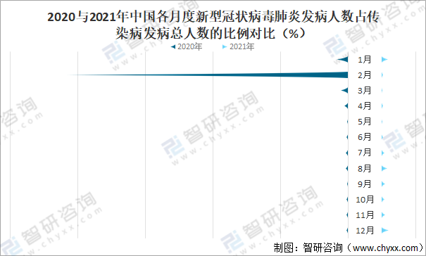 2020与2021年中国各月度新型冠状病毒肺炎发病人数占传染病发病总人数的比例对比(%)