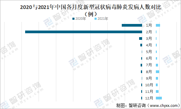 2020与2021年中国各月度新型冠状病毒肺炎发病人数对比(例)